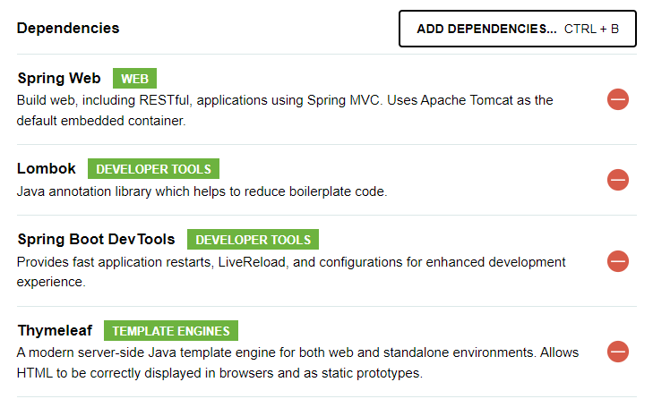 Spring Boot νλ‘μ νΈλ₯Ό μμ±ν λ μ νν μ μλ μ¬λ¬ μμ‘΄μ±λ€ μ€ DevTools, Spring Web, Thymeleaf, Lombok